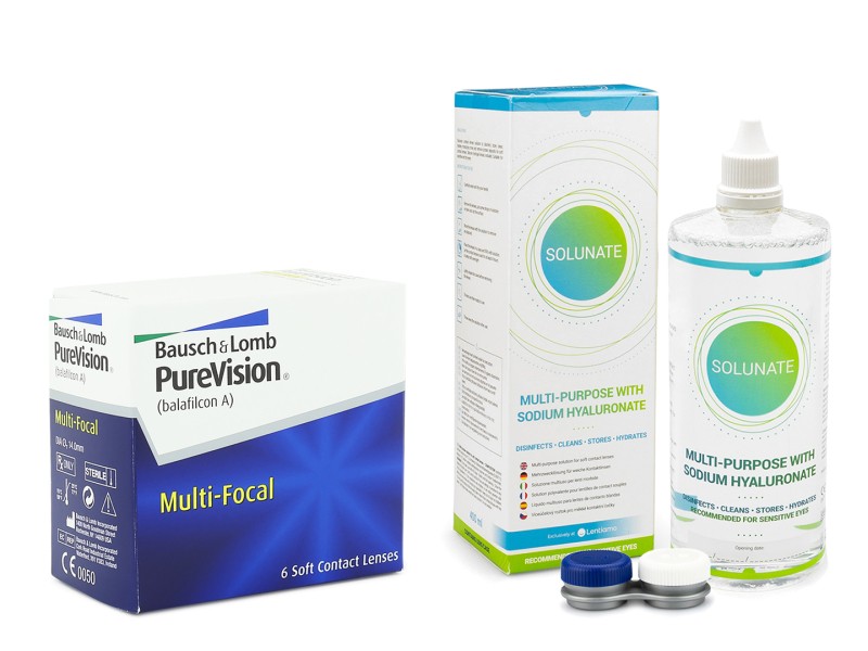 Les lentilles de contact mensuelles PureVision Multi-Focal (6 lentilles) offertes dans un paquet avantageux avec la solution Solunate Multi-Purpose 400 ml.